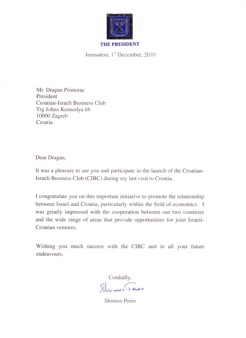 The Croatian-Israeli Business Club (CIBC), established in 2010 during the official visit of the President of Israel Shimon Peres to Croatia, is a voluntary organization of Croatian and Israeli companies and individuals focused on the enhancement and promotion of business relations, trade and investment between Croatia and Israel. One of the core strengths of the Croatian- Israeli Business Club are the numerous partner institutions it cooperates with, such as the Israeli-American Chamber of Commerce and Industry, the Government of the Republic of Croatia, the Government of the State of Israel, the Embassy of the State of Israel in Croatia, the Embassy of the Republic of Croatia in Israel etc.